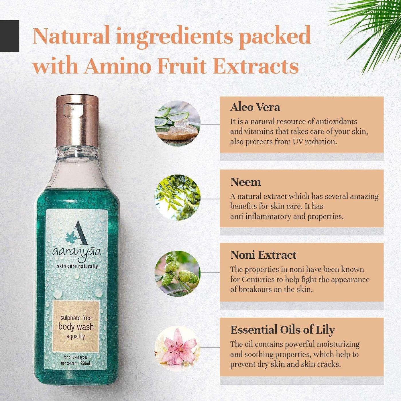 CLEANSING & EXFOLIATION : This Aaranyaa body wash thoroughly cleanses skin pores, removes grime, dirt and excess oil. It gently exfoliates dead cells and leaves skin soft, smooth, and moist.